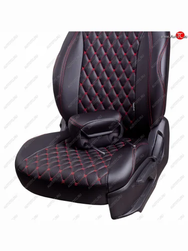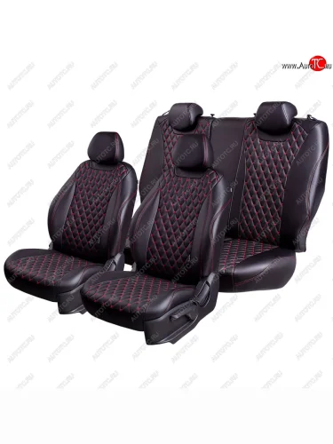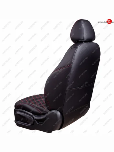 Чехлы для сидений (Люкс) Lord Autofashion Байрон (экокожа, 60/40, 3 Г-образных подголовника) Лада ВАЗ Гранта FL (2018-2025) 2191, 2190, 2194, 2192 (Черный, вставка черная, строчка красная)