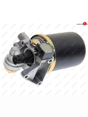 Сжатый воздух из нагнетательного трубопровода компрессора подводится к выводу 1 и далее в полость А, проходит последовательно через фильтры 17 и 3, цеалитовый адсорбер 18 и попадает в полость Б. Параллельно сжатый воздух из полости А подается на предохранительный клапан 11. В полости Б очищенный и осушенный сжатый воздух отжимает обратный клапан 6, проходит в полость В и через вывод 21 в пневмосистему транспортного средства. Параллельно из полости Б через канал Д сжатый воздух поступает в полость Г и далее в регенерационный ресивер (вывод 22). Из полости В через канал Е давление сжатого воздуха передается на следящий поршень 7 и управляющий сферический клапан 14. Деформационно-силовая характеристика пружины 8 следящего поршня 7 подобрана таким образом, что при давлении в пневмосистеме транспортного средства менее значения 0,8-0,05 МПа управляющий сферический клапан 14 плотно прижат к седлу и давление сжатого воздуха не передается на поршень 13, связанный тягой с предохранительным клапаном 11, который усилием пружины 10 прижимается к своему седлу. При превышении давления воздуха в пневмосистеме транспортного средства значения 0,8-0,05 МПа следящий поршень 7 перемещается вправо, сжимая пружину 8, и клапан 14 по мере уменьшения предварительного сжатия своей пружины отходит от своего седла вместе со следящим поршнем 7, передавая давление сжатого воздуха на поршень 13 предохранительного клапана 11.