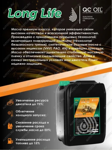 QCLLM15W40P20Масло моторноеQC OIL15W-40 MOTO 4T LL Современное высококачественное плакирующее полусинтетическое моторное масло для 4-хтактных двигателей водной техники. Производится из высокоочищенных и высокоиндексных базовых масел III, IV, V (VHVI, PAO, AN) групп, плакирующего полимера, созданного по технологии безызносного трения, и сбалансированного пакета присадок последней разработки.