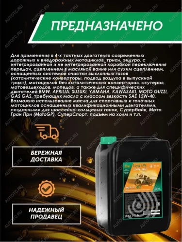 Продукт также применяется в силовых узлах и транспортных средствах где требуются следующие спецификации: MERCURY MARINE; YAMAHA; VOLVO PENTA; SUZUKI MARINE; TOHATSU; SELVA; HONDA MARINE, BOMBARDIER.моторное масло 4Т для мотоциклов; масло моторное; моторное масло 15w-40; масло моторное 15w40; mitsubishi; mazda; масла и жидкости; двигатель бензиновый; масло 15w40; 15w40 ;масло для мотоциклов 4Т; масло для снегоходов 4ТLong LifeКласс 3. Легковоспламеняющиеся жидкости1080201Полусинтетическое4Т15W-40SNSMSLSHSGБензинMA-2Моторные масла для дизельных и (или) карбюраторных (инжекторных) двигателейКвадроциклыМотоциклыПластиковая канистра245*283*405Россияпластиковая канистра 20л2710198200 - Моторные масла, компрессорное смазочное масло, турбинное смазочное маслоМоторное масло 15W-40 МОТО 4Т QC OIL Long Life полусинтетическое плакирующее, канистра 20лВозможно опасенsafe360Auto&MotoМасла и автохимияМасла автомобильныеАвтохимия - Масло моторноеQC OIL Long Life 15W-40 , Полусинтетическое, 20 лLong Life 15W-40 Масло моторное, Полусинтетическое, 20 лLong Life 15W-40 , Полусинтетическое, 20 л1518152027100050010000003819000000Жидкость тормозная