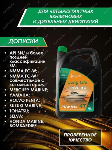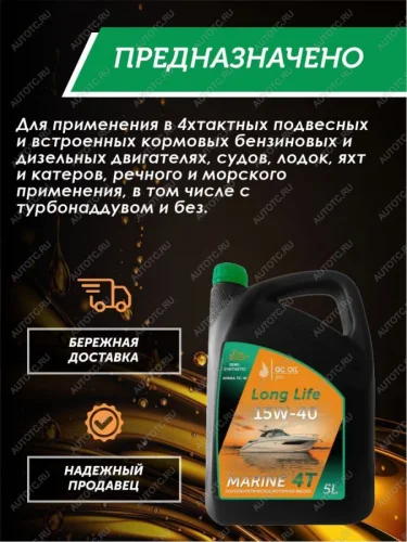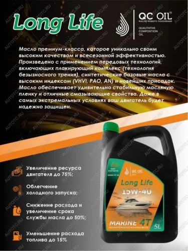 Масло QC OIL Long Life 10W-40 MARINE 4T создано для применения в 4-хтактных подвесных и встроенных кормовых бензиновых и дизельных двигателях, судов, лодок, яхт и катеров, речного и морского применения, в том числе с турбонаддувом и без.