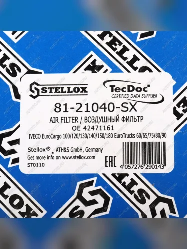 | Наименование | Фильтр воздушный IVECO Eurocargo STELLOX STELLOX 81-21040-sx |