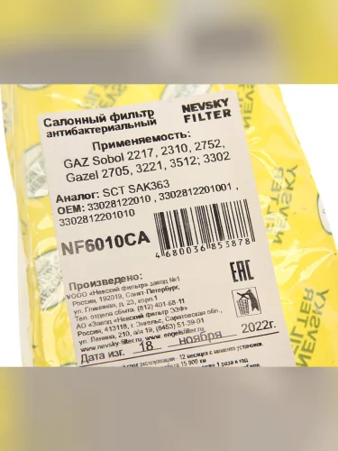Фильтр воздушный салона ГАЗель Соболь антибактериальный NEVSKY FILTER