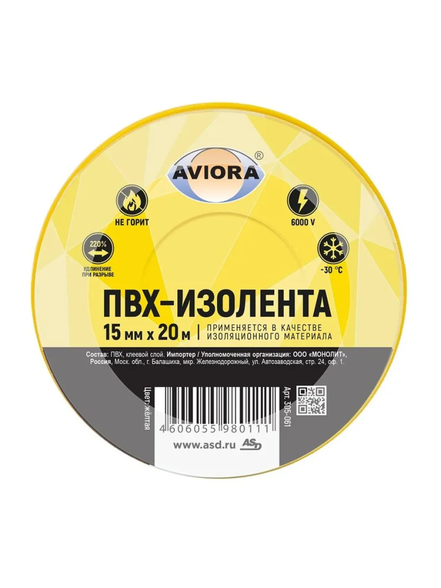 | Наименование | Изолента ПВХ желтая 15x0.13мм 20м AVIORA |