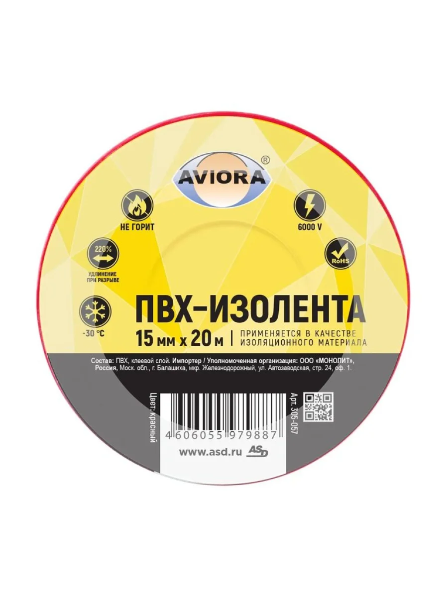 | Наименование | Изолента ПВХ красная 15x0.13мм 20м AVIORA |