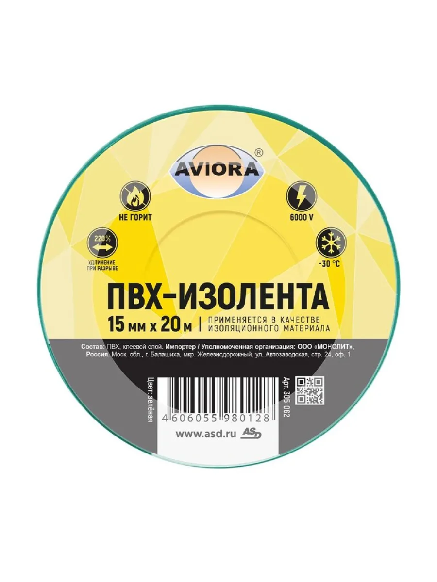 | Наименование | Изолента ПВХ зеленая 15x0.13мм 20м AVIORA |