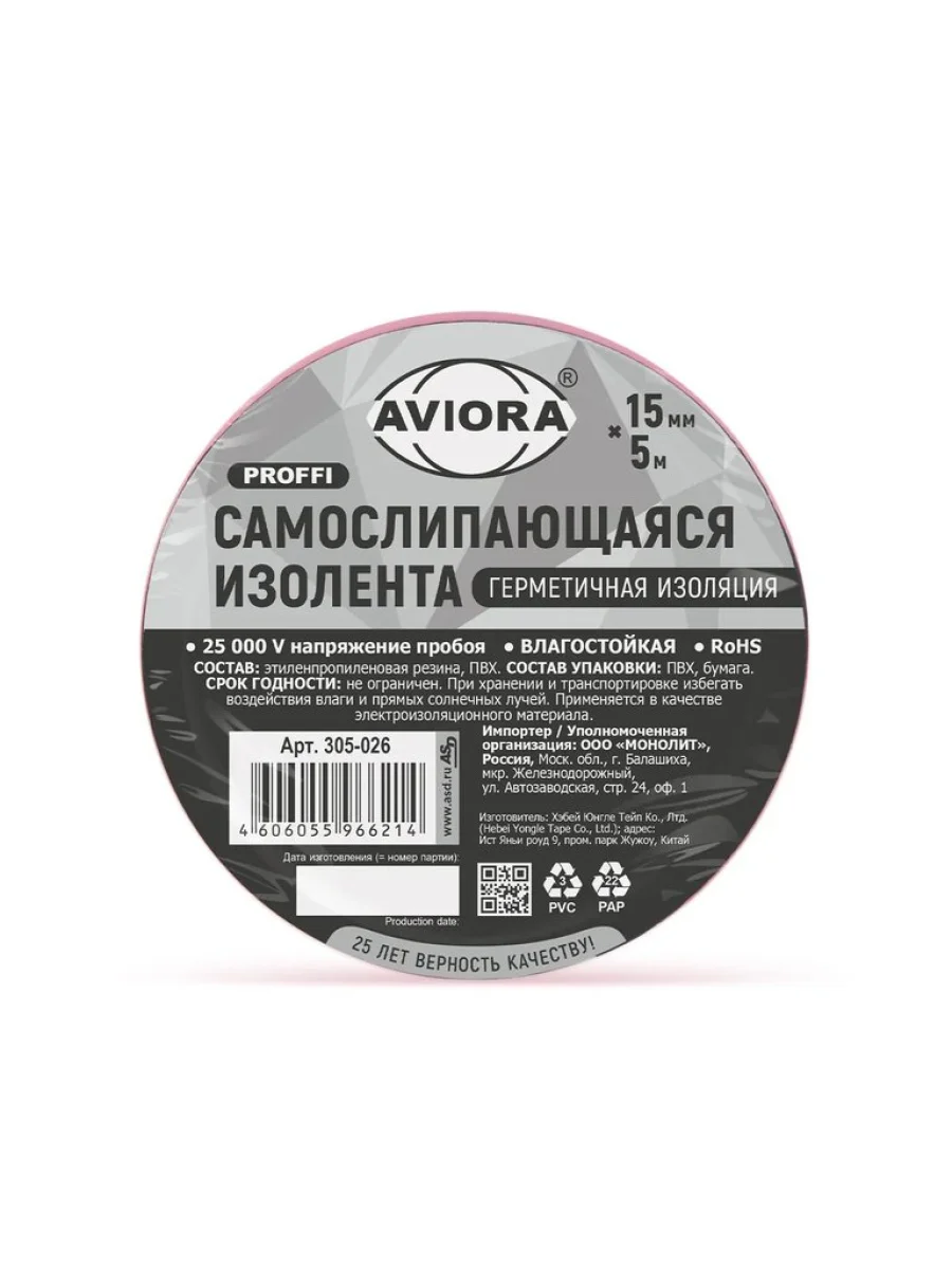 | Наименование | Изолента самослипающаяся 15x0.8мм 5м влагостойкая AVIORA |