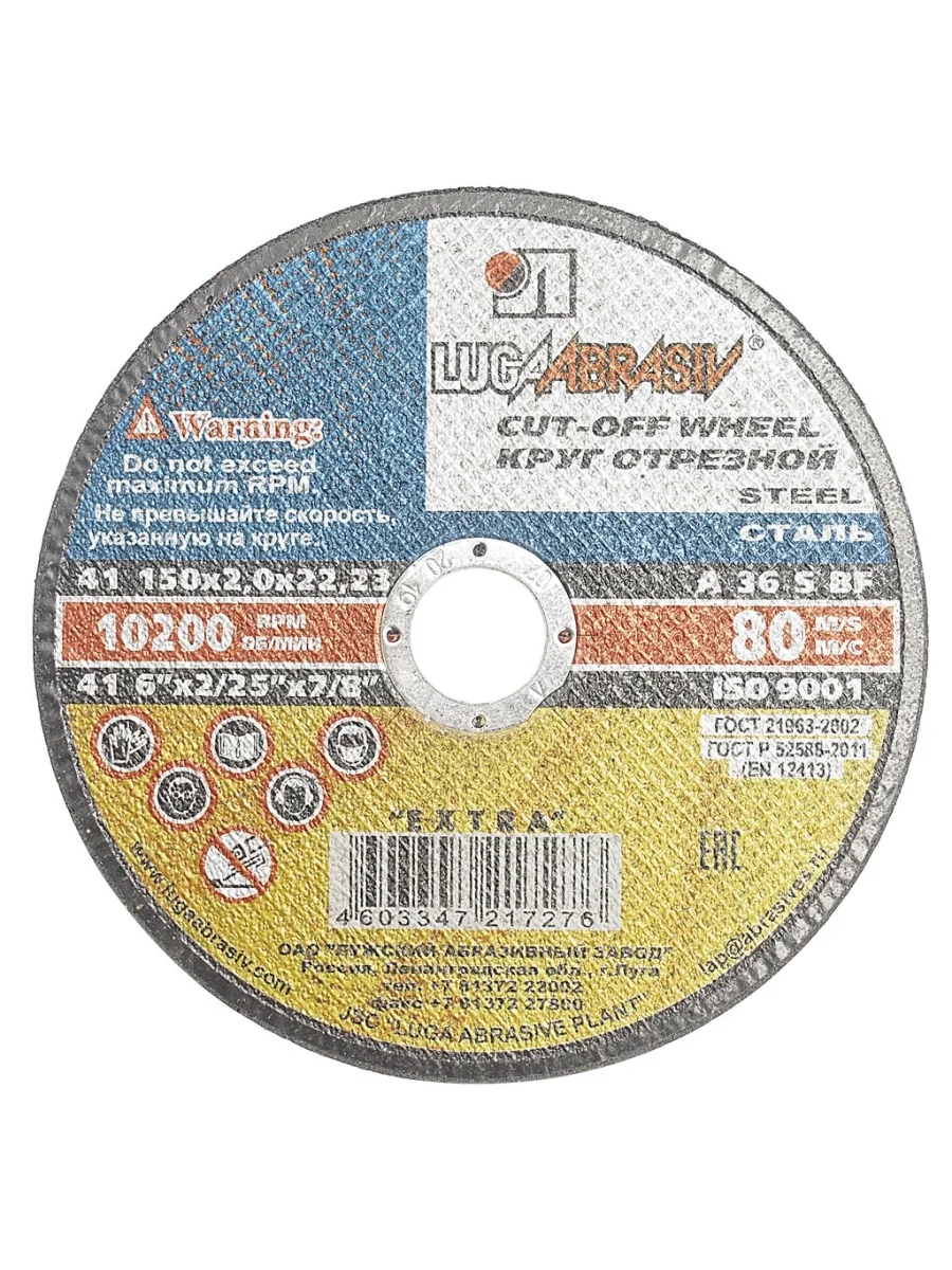 | Наименование | Круг отрезной по металлу 150х2.0х22мм А36 LUGAABRASIV |