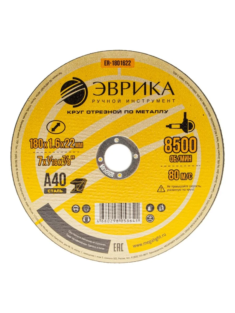 | Наименование | Круг отрезной по металлу 180х1.6х22.2мм А40 ЭВРИКА |