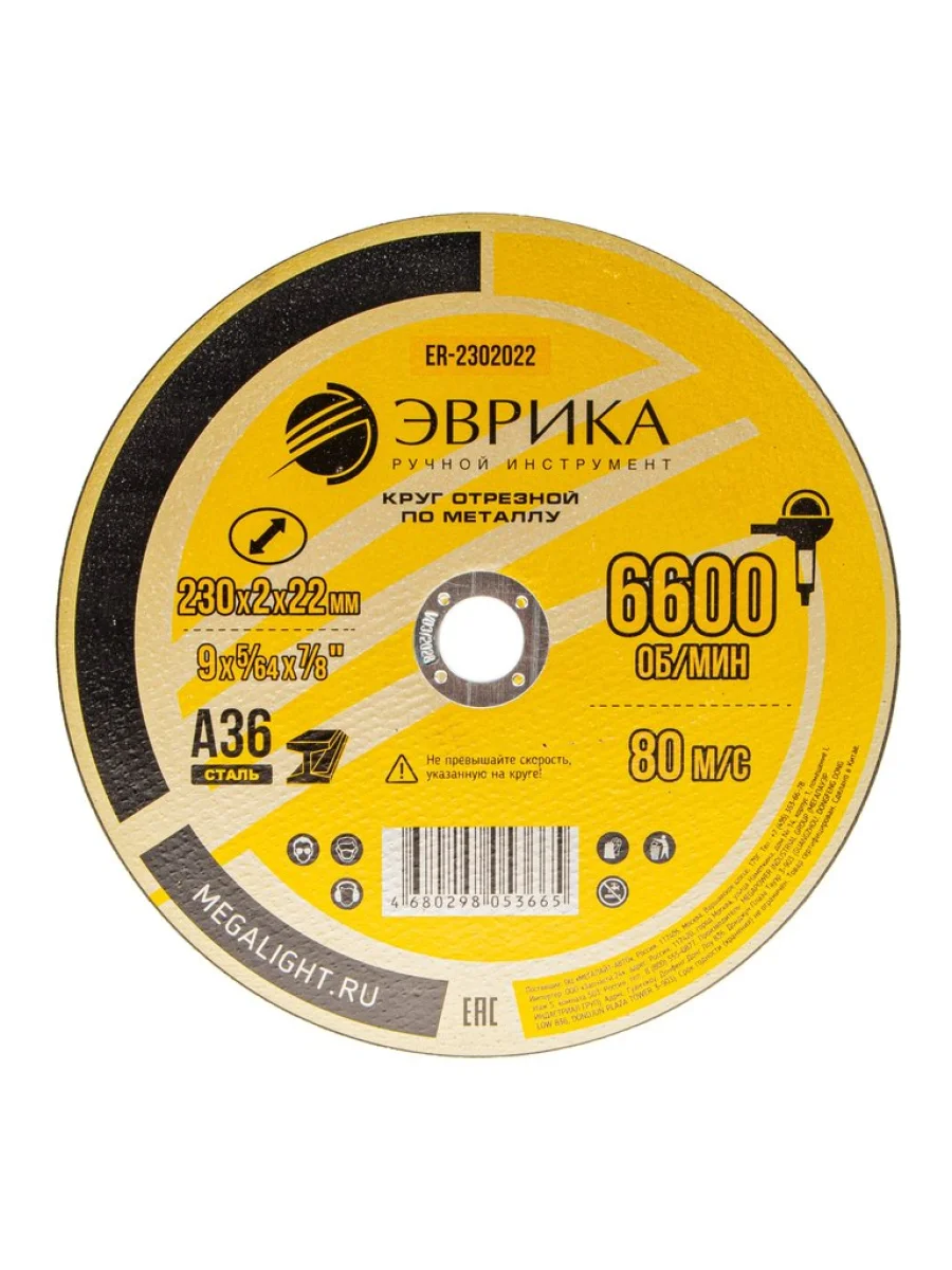 | Наименование | Круг отрезной по металлу 230х2х22.2мм А36 ЭВРИКА |