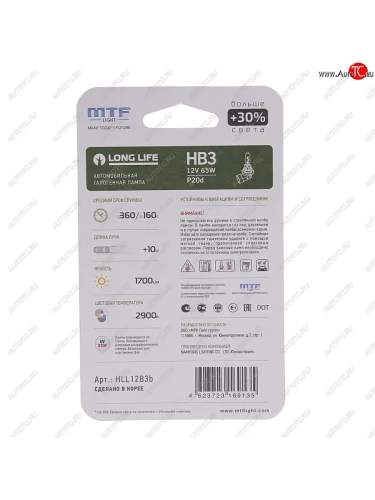 | Наименование | Лампа 12V HB3 65W P20d +30% блистер (1шт.) Long Life MTF MTF hll12b3b |