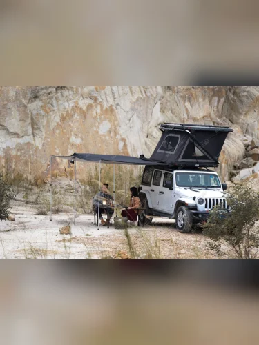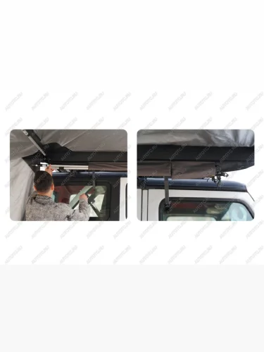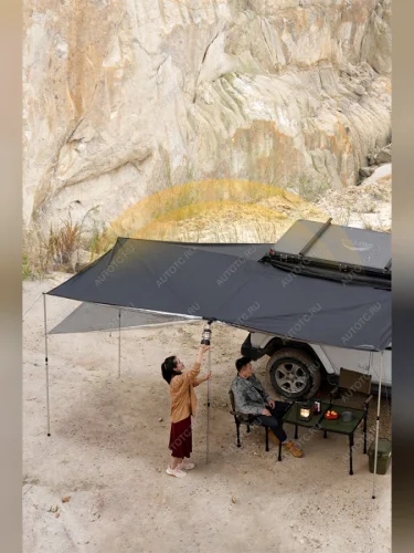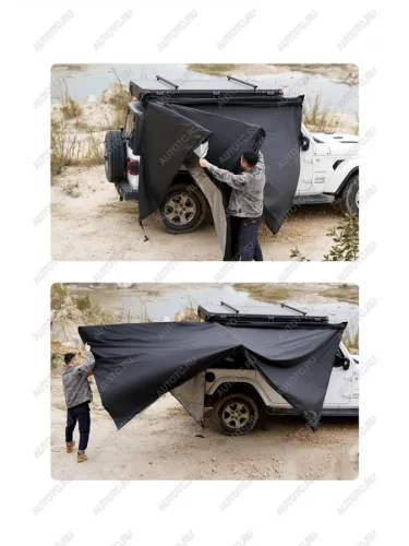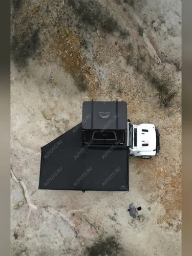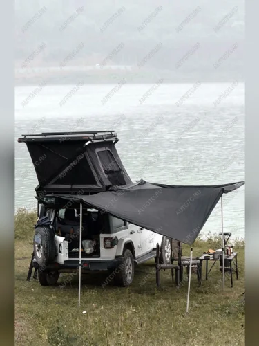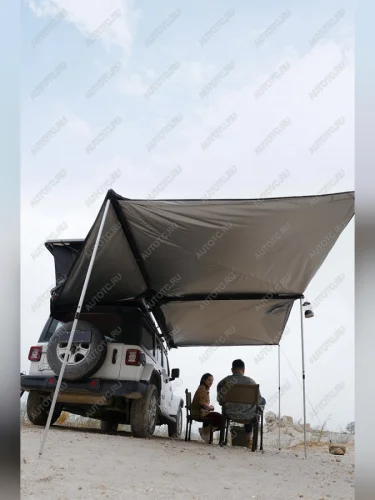 Размер тента в рабочем состоянии: 2,4 метра по стороне, которая крепится к автомобилю и 2,2 метра по вылету. Такой тент позволяет с комфортом разместить рядом с автомобилем 4-6 человек.