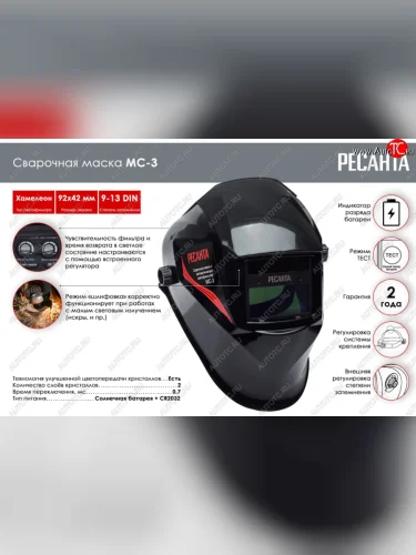 Сварочная маска РЕСАНТА МС-3 предназначена для защиты глаз от видимого, ультрафиолетового и инфракрасного излучения, а также для защиты головы и шеи от попадания искр при сварочных работах. Маска данного типа удобна, поскольку светофильтр автоматически затемняется при зажигании дуги. Такой светофильтр назвали «хамелеоном» из-за способности автоматически затемняться. Степень затемнения можно настраивать с помощью встроенного регулятора в зависимости от модели маски.