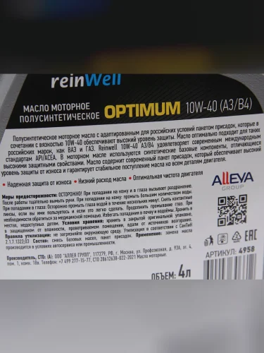 | Наименование | Масло моторное A3B4 10W40 псинт.4л REINWELL REINWELL 4958 |