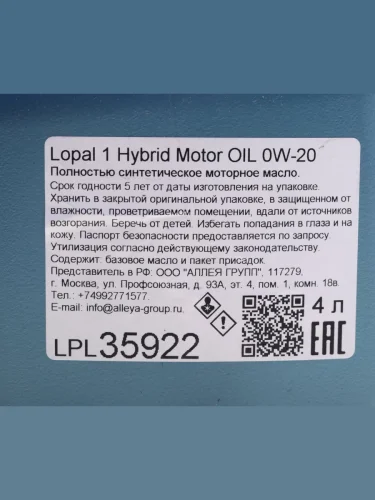 | Наименование | Масло моторное HYBRID MOTOR OIL E 0W20 синт.4л LOPAL |