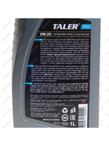 | Наименование | Масло моторное PRO SPCF-6 0W20 синт.1л TALER TALER 700122 |
