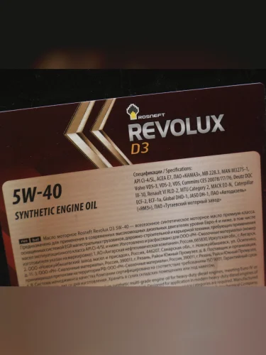 | Наименование | Масло моторное РОСНЕФТЬ REVOLUX D3 5W40 E7CI-4SL синт.20л |
