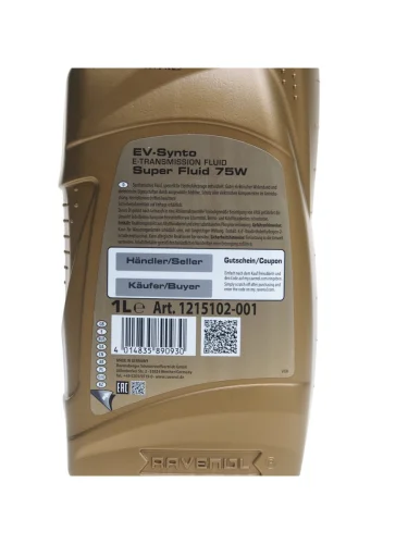 | Наименование | Масло трансмиссионное для электромобилей EV-Synto Super Fluid 75W E-TF RAVENOL |