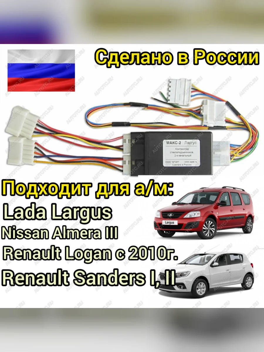 МАКС-2 устанавливается в автомобили LADA Largus, в которых коллекторные двигатели стеклоподъемников управляются кнопками напрямую. Полный набор функций обеспечивается при подключении контроллера МАКС-2 Largus к охранной сигнализации или центральному замку автомобиля.