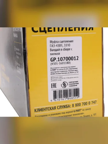 | Наименование | Муфта сцепления ГАЗ-4301 3310 Валдай в сборе с вилкой G-PART (ОАО ГАЗ) G-PART gp.10700012 |