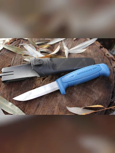 Нержавеющая сталь, примененная для изготовления клинка, обладает показателем твердости 56-58 пунктов по шкале Роквелла (HRC), что, несомненно, сказывается на прочности и износостойкости последнего в лучшую сторону, однако накладывает ограничения на использование ножа для рубки. Рукоятка сделана из пластика синего цвета с надписью Morakniv, которую обычно наносят на ножи компании Mora of Sweden.
