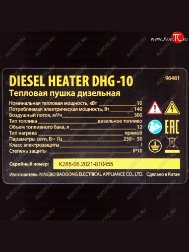 | Наименование | Пушка тепловая 10кВт 300куб.мч дизельная DENZEL DENZEL 96481 |