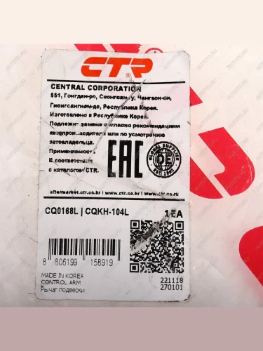 | Наименование | Рычаг подвески HYUNDAI Santa Fe (12-) передней нижний левый CTR CTR cq0168l |