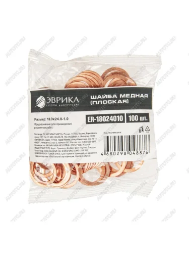 Шайба 18.0х24.0х1.0 медная (плоская) ЭВРИКА ЭВРИКА er-18024010