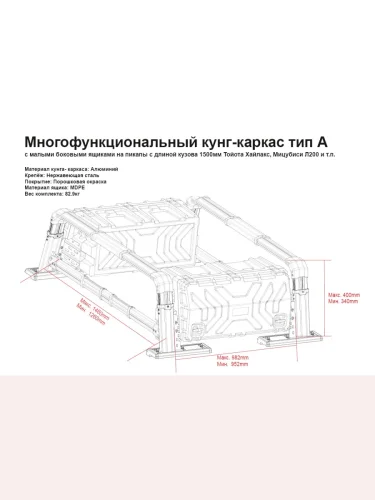 Многофункциональный кунг-каркас Baja Racing представляет из себя пространственную регулируемую конструкцию из алюминиевых профилей которая крепится на борта кузова пикапа при помощи струбцин.