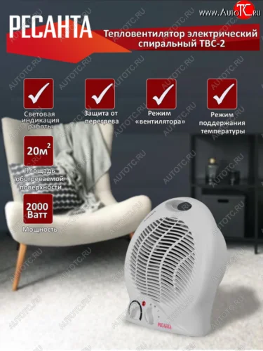| Наименование | Тепловентилятор бытовой 2.00кВт (20кв.м) напольный белый РЕСАНТА РЕСАНТА 6722 |