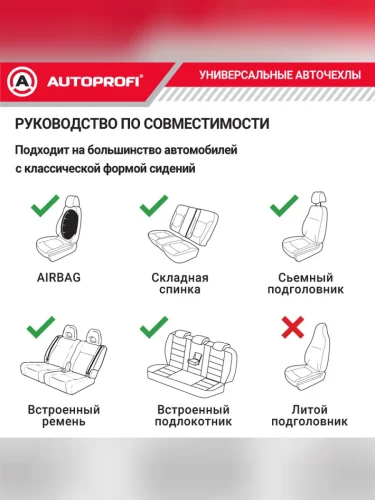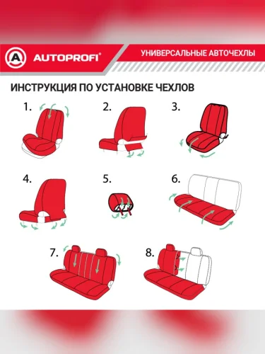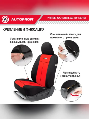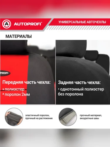 | Наименование | Универсальные чехлы сидений (9 предм., полиэстер, AIRBAG, 40/60, 50/50, 60/40) AUTOPROFI (черно-красные) |