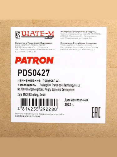 | Наименование | Вал привода PEUGEOT Boxer CITROEN Jumper (06-) колеса переднего правого PATRON PATRON pds0427 |